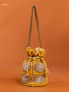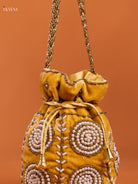 - Stunning yellow velvet potli bag embellished with intricate pearl and bead embroidery.